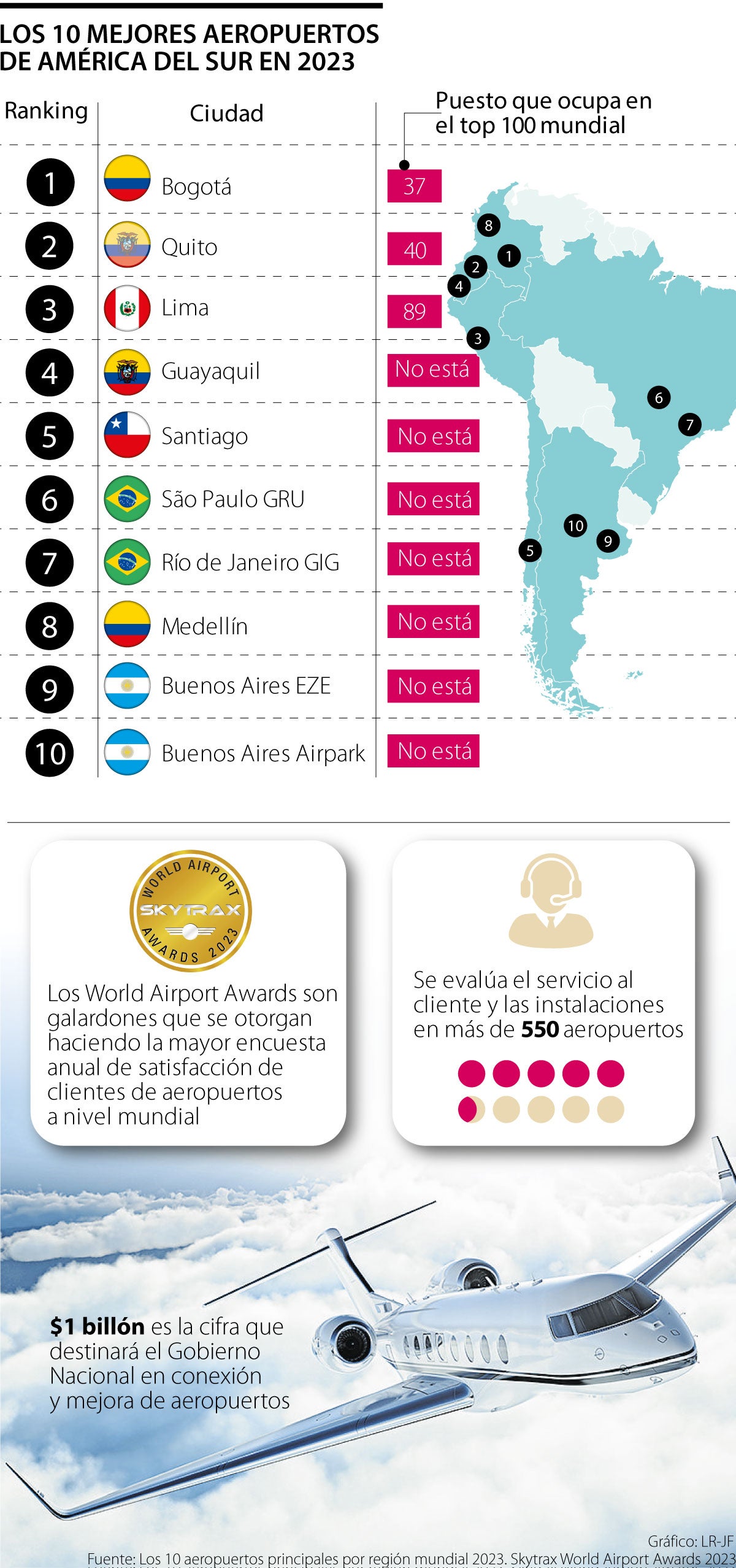 El ranking también reveló que entre los 10 mejores aeropuertos regionales de Suramérica 2023 está el de Medellín, en tercer lugar; y Cartagena, en el octavo.