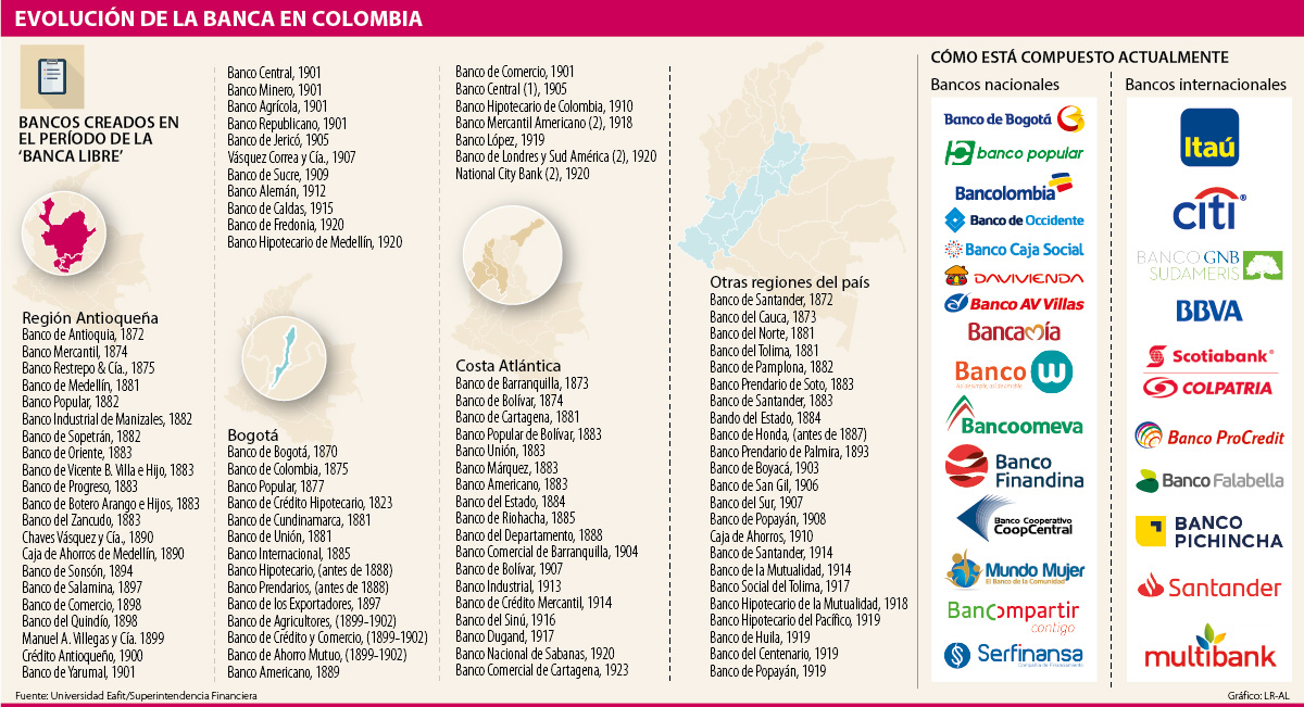 La banca local ha tenido que transitar un camino largo para llegar al lugar en el que está. El inicio del crédito en Colombia se remonta al siglo XIX cuando el circulante lo componían monedas de oro, plata, níquel y cobre, y los controlaba la Iglesia, hasta que en 1870 se creó el Banco de Bogotá que se impulsó con la defensa de la libertad para la iniciativa económica privada de la Constitución de Rionegro y el auge de las exportaciones.