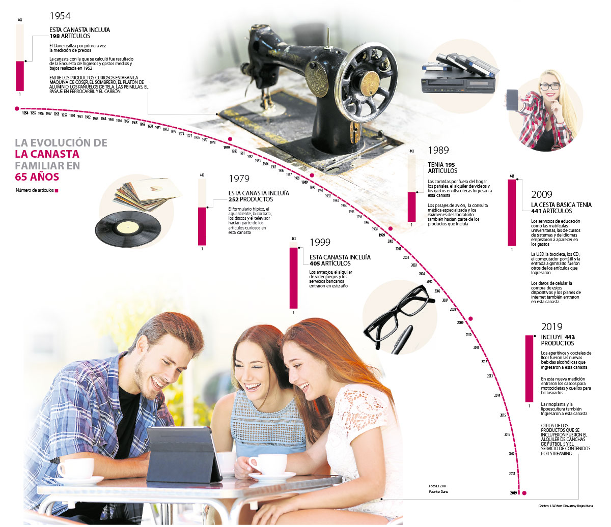 La quinta canasta familiar, que empezó a regir en 2009, incluyó 441 productos, entre los que ingresaron la USB, la bicicleta, el Baloto, los CD, el computador portátil, la entrada a gimnasio, los datos de celular, la compra de estos dispositivos y los planes de internet.