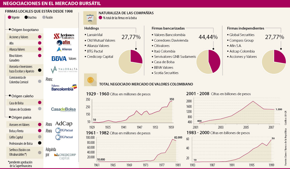 Sobre las comisionistas, estas han sido impactadas por los bajos niveles de negociación. Cuando comenzó el siglo XXI había 44 firmas, 22 en la Bolsa de Bogotá y 22 entre Medellín y Cali. Durante los últimos 20 años decenas han sido creadas, fusionadas y en su mayoría liquidadas, lo cual ha llevado a tener solo 19 activas dificultando la entrada de más de 45 millones de colombianos.