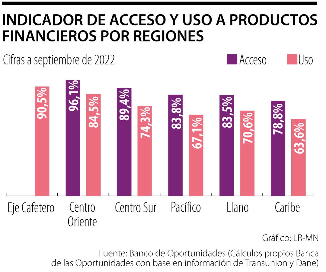 Según el más reciente informe de Banca de las Oportunidades, con corte a septiembre de 2022, la Región Caribe sigue estando rezagada en el tema de acceso y uso de productos financieros. Según este indicador, Caribe es la última región del listado en uso, con un indicador de 63,6%; y también ocupa el último lugar en el tema de acceso, con 78,8%. El Eje Cafetero y Centro Oriente tienen los indicadores más altos.