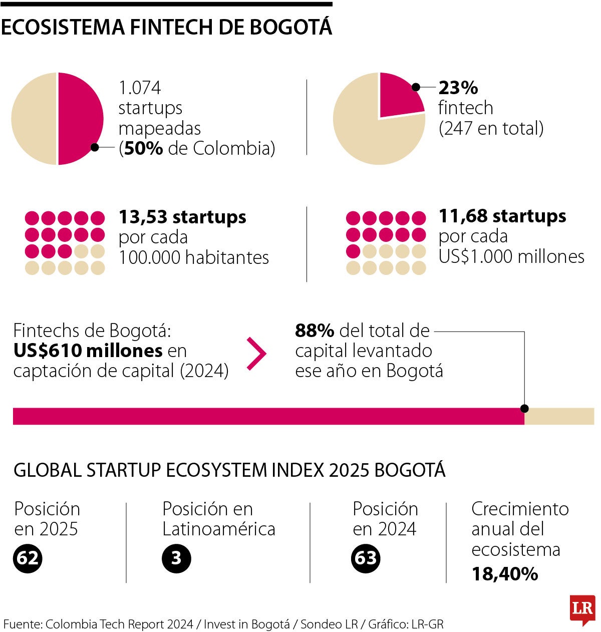 El ecosistema emprendedor bogotano se consolida entre los más potentes en Latinoamérica, y el sector fintech es responsable de su fortalecimiento. La ciudad ocupó la tercera posición en Latinoamérica en el Global Startup Ecosystem y, de las 1.074 empresas emergentes en operación, 23% (247) ofrecen servicios financieros.