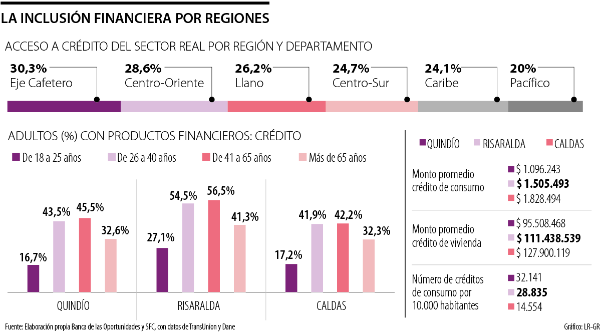 Según el informe de la Banca de las Oportunidades y la Superfinanciera, que trabajó con cifras al cierre de 2022, las regiones Eje Cafetero (30,3%) y Centro Oriente (28,6 %) registraron el mayor porcentaje de población con crédito en el sector real. Esto quiere decir que tres de cada 10 encuestados afirmó que acude a la banca tradicional para solicitar un préstamo de distinta índole. En sentido contrario, las regiones que tienen los menores niveles de acceso al crédito fueron: Pacífico (20%) y Caribe (24,1%).