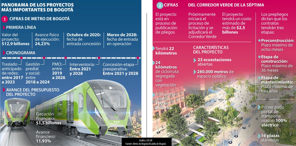 La capital del país está apostando actualmente por dos ambiciosos proyectos. La primera línea del Metro de Bogotá es la iniciativa prioritaria para mejorar la movilidad en la ciudad. Su avance físico es de 24,23% y se espera que entre a operar en 2028. Su costo estimado es de $12,8 billones. Y el segundo proyecto es el Corredor Verde de la Séptima, que tendrá una inversión de $2,5 billones. Cuando esté terminado, los capitalinos tendrán 22 kilómetros con transporte público 100% eléctrico, además de 280.000 metros cuadrados de espacio público. La séptima contará con 16 plazas con alamedas.