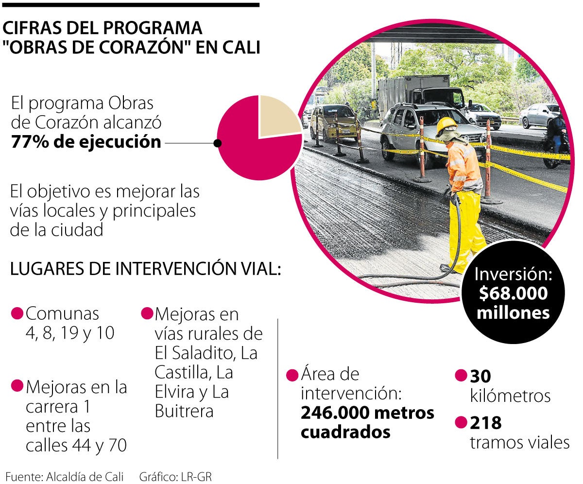 La Alcaldía de Santiago de Cali ha invertido $68.000 millones en la iniciativa llamada “Obras de Corazón”, cuyo objetivo es mejorar las vías locales y principales de la ciudad para “mitigar el deterioro de la malla vial”. Con un avance de 77% de intervención, el plan es cubrir 246.000 metros cuadrados, lo que equivale a 39 kilómetros y 218 tramos viales. Néstor Martínez Sandoval, secretario de infraestructura Distrital de Cali, dijo que “el trabajo no es provisional, es definitivo para garantizar la movilidad”.