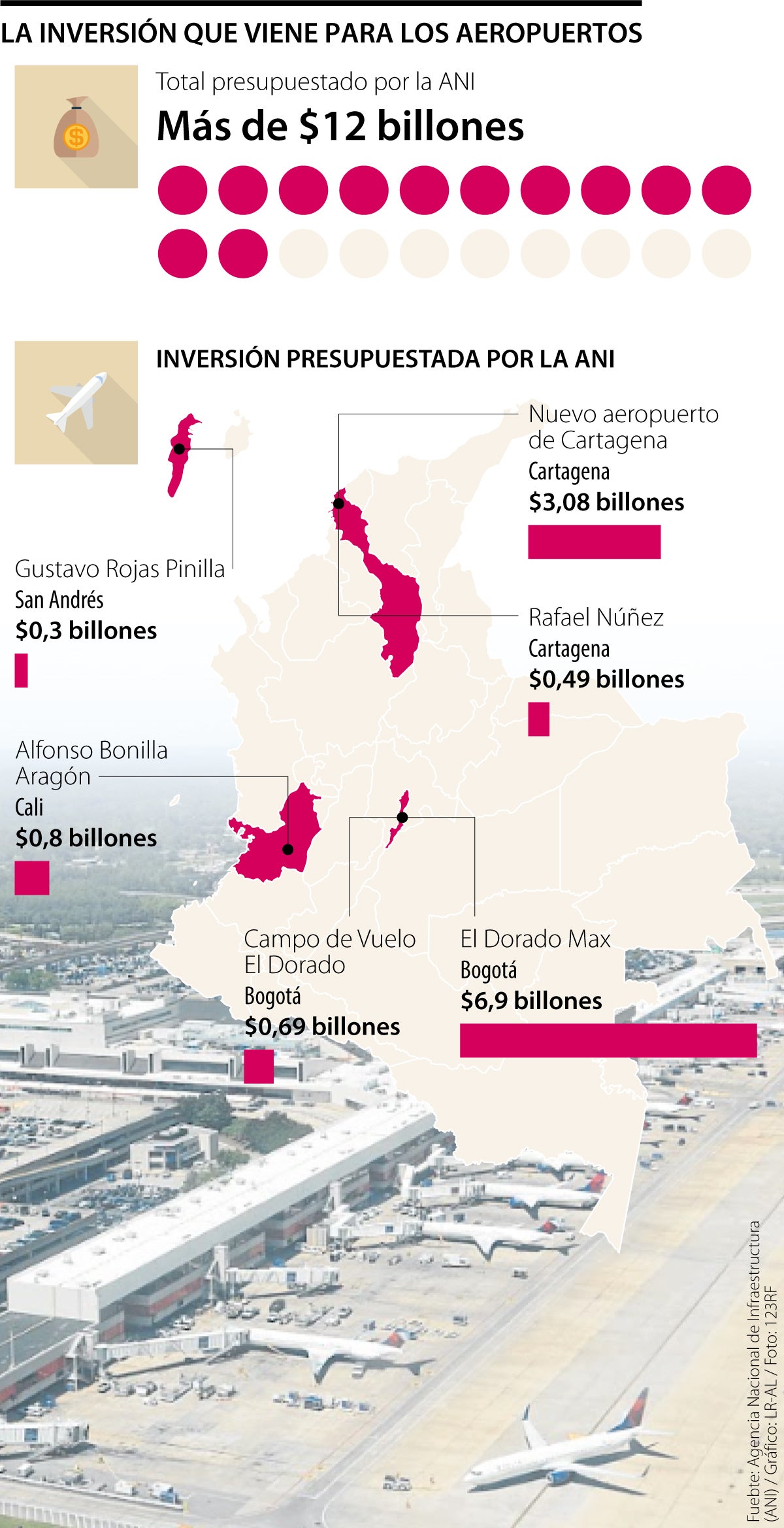 Según anunció la Agencia Nacional de Infraestructura (ANI) en meses pasados, se invertirán más de $12,2 billones en terminales como el Gustavo Rojas Pinilla, de San Andrés; el Alfonso Bonilla, de Cali; el Rafael Núñez, de Cartagena y El Dorado, de Bogotá. De igual forma, se tiene planeada la construcción del nuevo aeropuerto de Cartagena, en Bayunca, y el Campo de Vuelo de El Dorado.