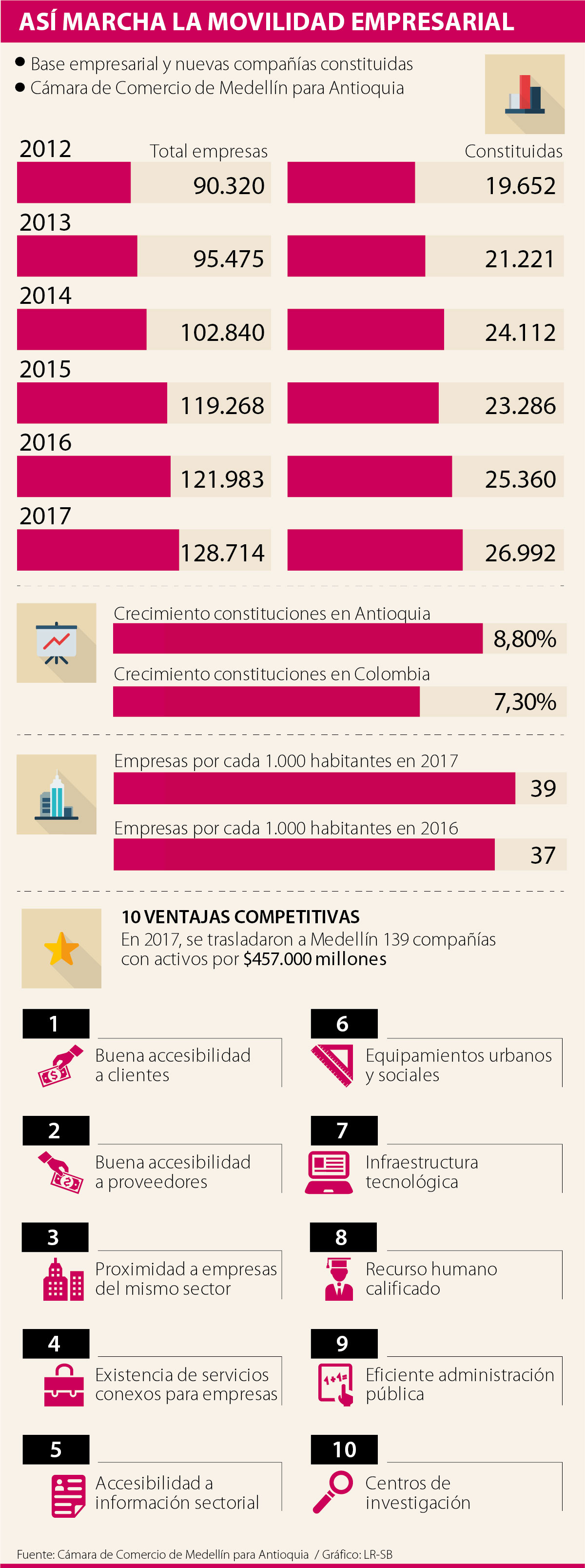 El posicionamiento de Antioquia y Medellín como uno de los principales centros de desarrollo económico y fomento empresarial se vio favorecido en 2017 por la constitución de 40.778 nuevas empresas, lo que representó un incremento de 8,8% frente a 2016. Esa variación en Colombia fue de 7,3 %, lo que refleja un rendimiento superior al promedio nacional, de acuerdo con datos de la Cámara de Comercio de Medellín para Antioquia.
