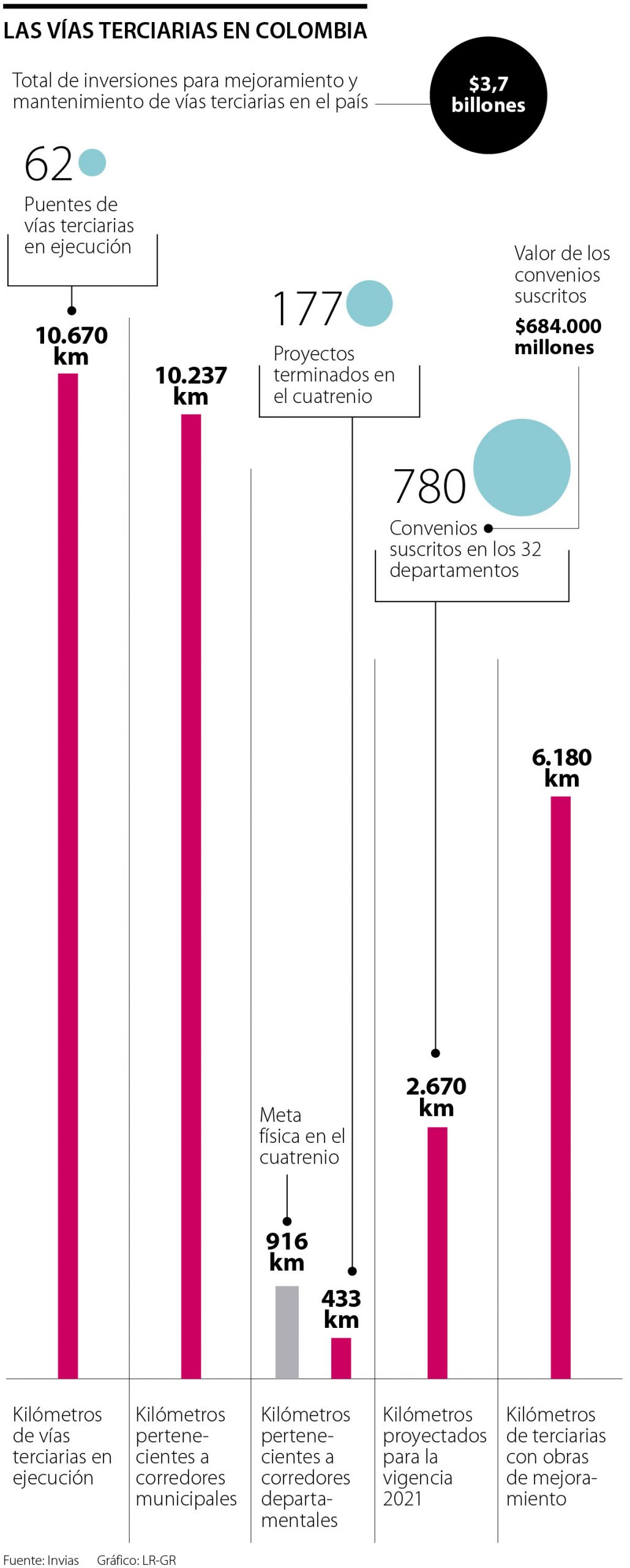 En el país, 8 de cada 10 municipios han tenido al menos una inversión en vías terciarias. Del total de la proyección del cuatrienio del Gobierno Nacional se han terminado 177 proyectos con una meta física de 916 kilómetros, una inversión de $877.609 millones y se encuentran en ejecución 182 proyectos con un objetivo físico de 1.754 kms, que representan una inversión de $1,92 billones.