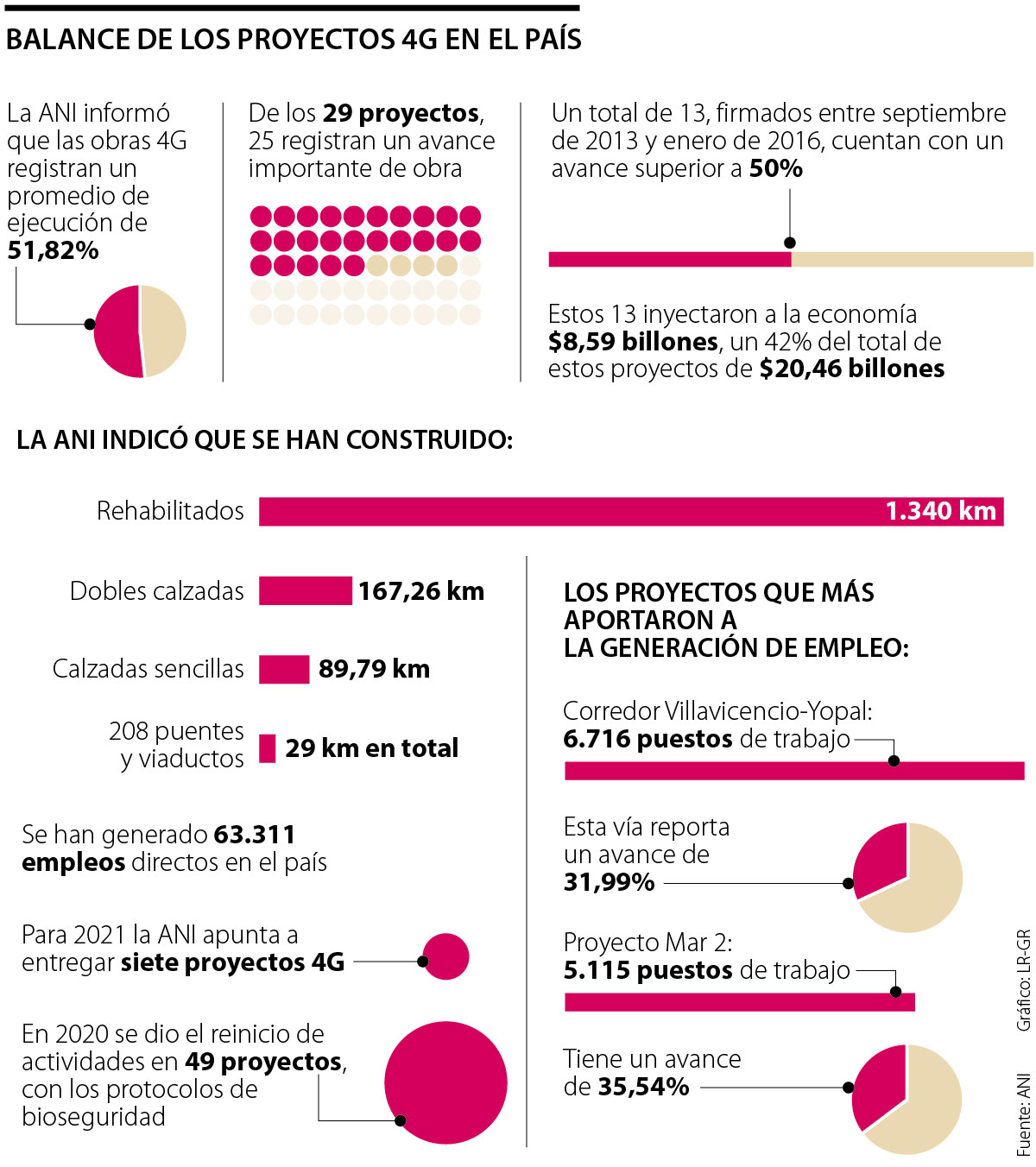 Según informó la Agencia Nacional de Infraestructura (ANI), de los 29 proyectos del programa de cuarta generación, 25 registran un avance importante de obra y otros fueron reactivados.