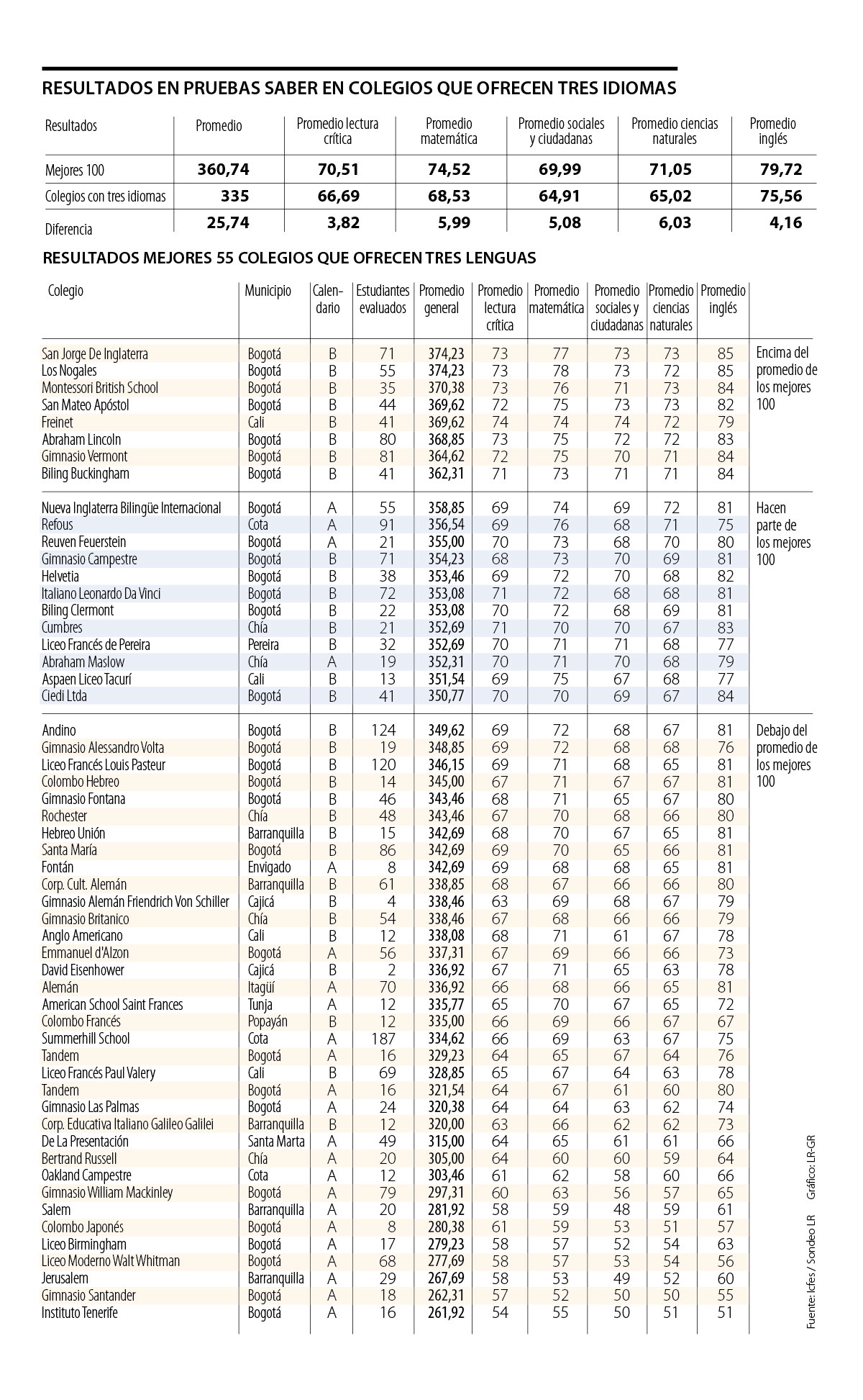 Al analizar los resultados también se vio que 20 de los 55 colegios que ofrecen un pénsum con tres idiomas en el país se encuentran dentro del top 100. Allí hay algunos como el Colegio Nueva Inglaterra Bilingüe Internacional, de Bogotá, del cual se presentaron 55 alumnos, y obtuvo un promedio de 358,85, junto con el Refous, ubicado en Cota, en el que participaron 91 estudiantes y obtuvo un promedio de 356,54.