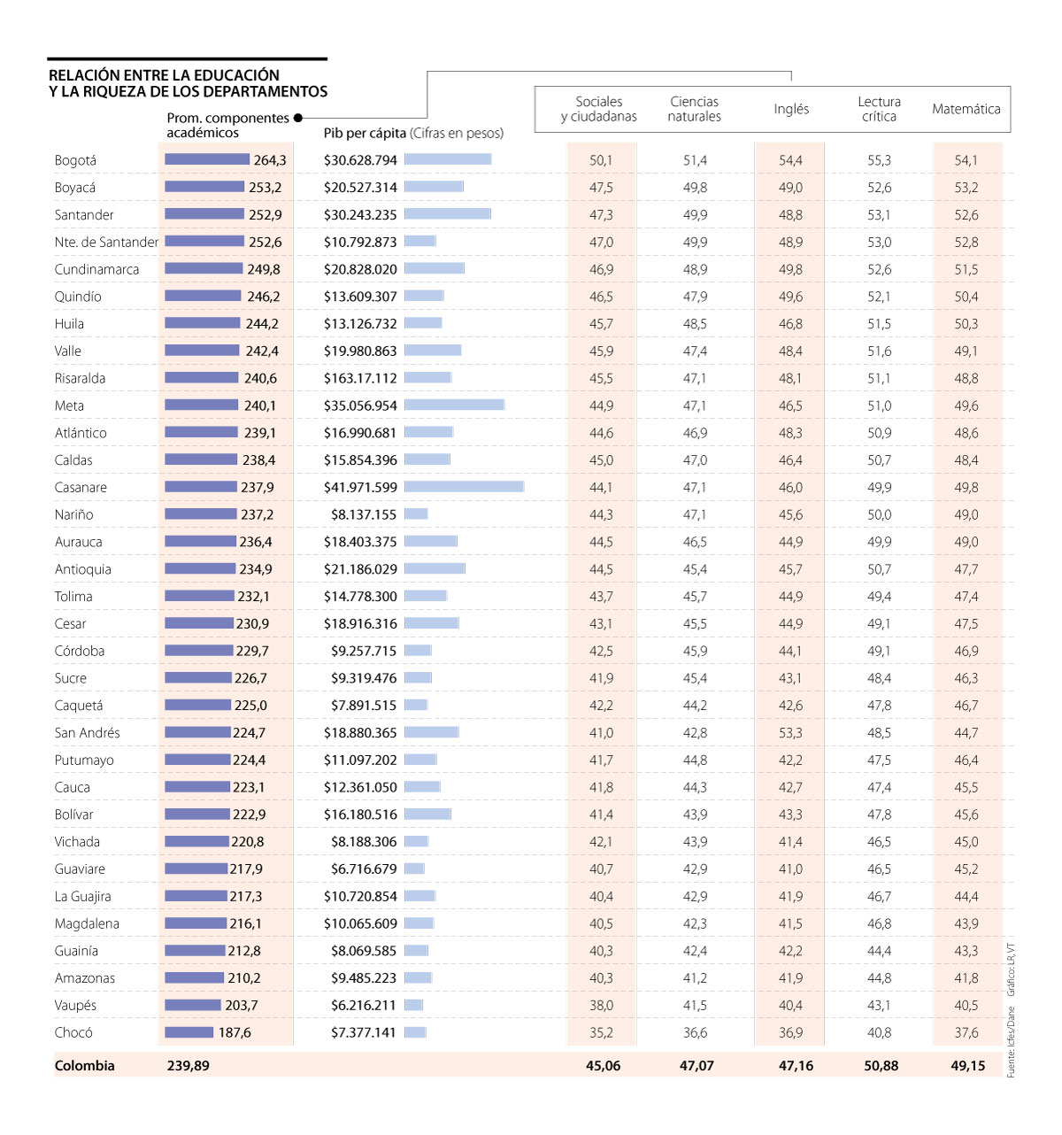 En un ejercicio de análisis, LR contrastó dichos resultados contra el PIB per cápita de cada departamento, el cual mide la relación entre el nivel de renta de un lugar y su población; en otras palabras es un indicador de riqueza, lo que para el análisis es relevante, ya que permite conocer el nivel de relación entre dicho indicador y el desempeño académico de los estudiantes de cada región.