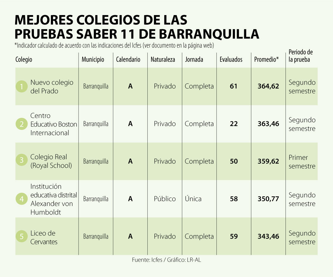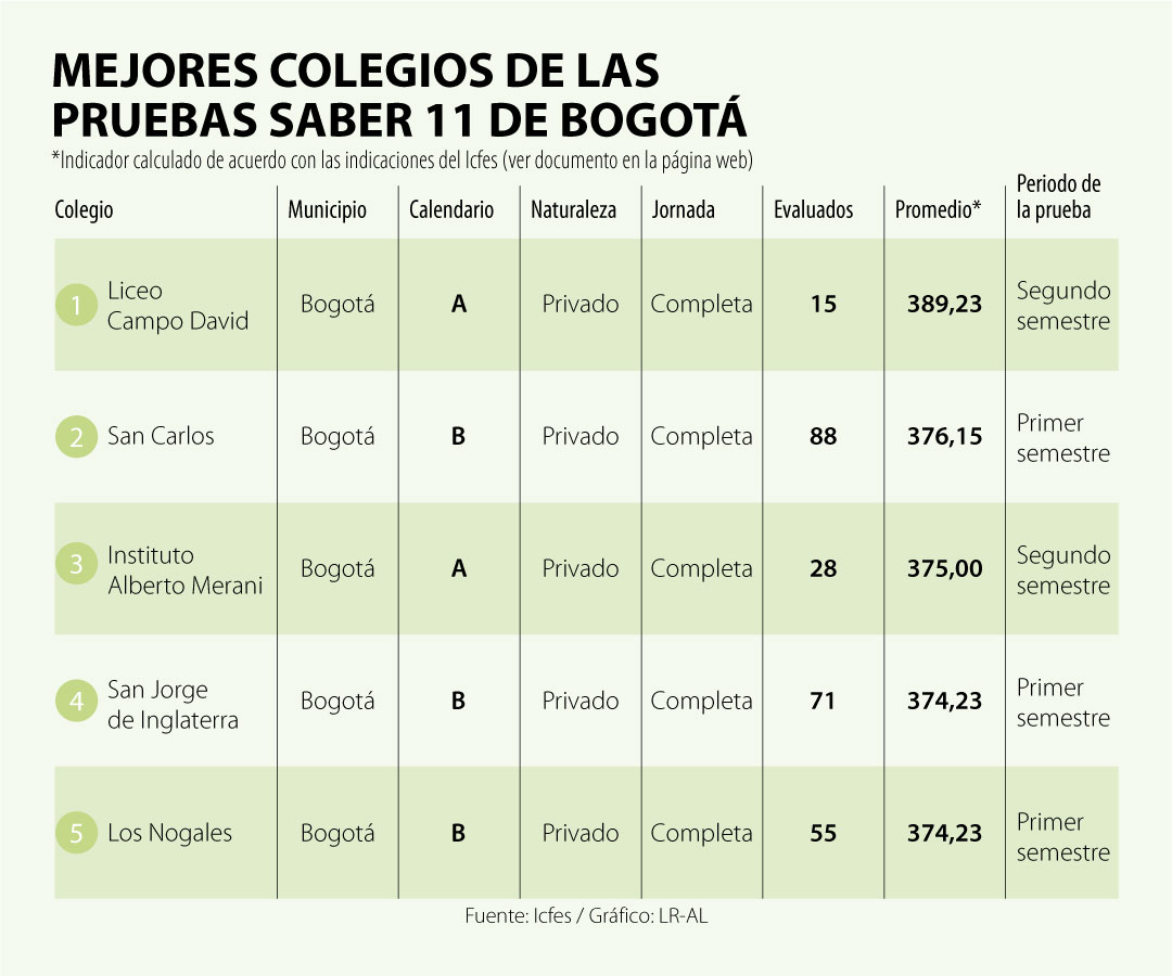 Teniendo esto presente, LR elaboró un ranking de los mejores colegios del país y en algunas ciudades. Para hacer esta cuenta, utilizamos los resultados agregados de las pruebas Saber 11 del primer y segundo semestre de este año, publicadas en la página del Icfes, y calculamos el promedio ponderado de la calificación, de acuerdo con las guías de la entidad (vea las tablas completas y la guía para el desarrollo de los promedios en la parte final de este texto o acceda directamente a la página del Icfes). Finalmente, aplicamos un último filtro, que fue excluir del listado a los colegios con menos de 10 estudiantes participando en la prueba.