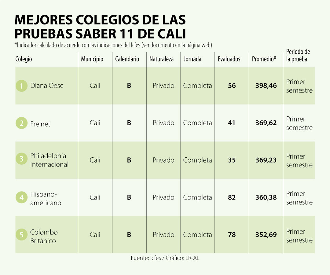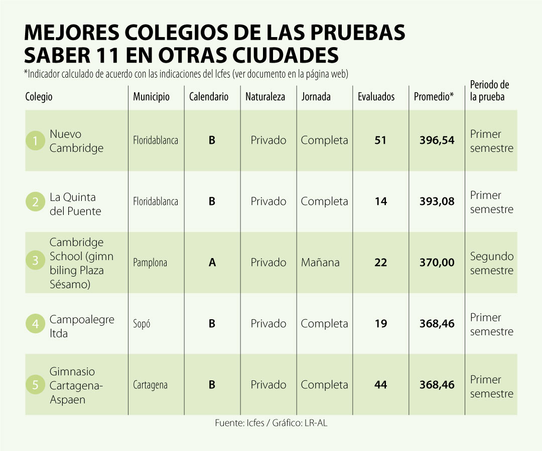 En el listado de los primeros tres colegios, el primero es uno de Cali: el bilingüe Diana Oese. Llama la atención que el podio del desempeño en las pruebas Saber lo cierran dos colegios de un municipio que no está entre las grandes ciudades: Floridablanca, en el departamento de Santander, con los colegios Nuevo Cambridge y La Quinta del Puente. De acuerdo con Helen Orjuela, profesora de la Universidad Externado, estos son tres ejemplos que muestran que la buena educación no está solo en Bogotá.