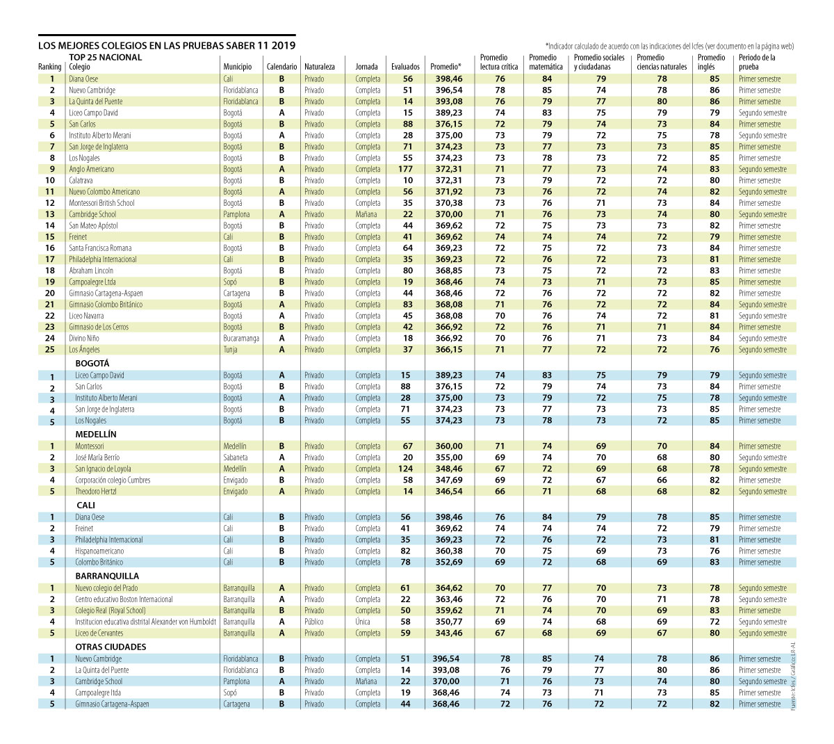 Dentro de las primeras 10 entidades, solo hay tres ciudades: Cali, Floridablanca y Bogotá, y llama la atención que dentro de los primeros 25 colegios del listado no aparece ninguno de Medellín o sus municipios aledaños (como Sabaneta o Envigado). El primero de esta ciudad, el Montessori, está en la posición 45 del ranking.