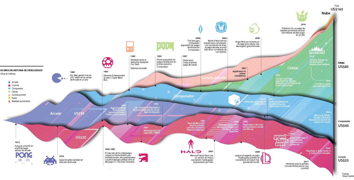 Al combinar los dos grandes auges del confinamiento, la tecnología y las actividades en el hogar, la industria de los videojuegos se posicionó como unas de las líderes este año reportando crecimiento acelerado en todo el mundo. Para entender la magnitud de este mercado es necesario retomar los hitos más relevantes de su historia.