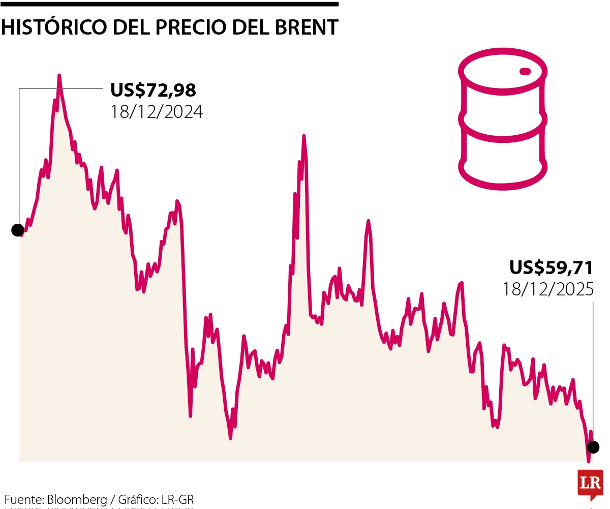 El comportamiento del precio diario del Brent estuvo por debajo de las proyecciones hechas a finales del año pasado, cuando se estimaba que se ubicara entre los US$75 y US$80 por barril. No obstante, la incertidumbre y la volatilidad rigieron el precio que tocó precios bajos a comienzos de este mes, al ubicarse por los US$60. Se estima que al cierre de año el precio no variará mucho y esta tendencia se mantendría durante 2026 con un precio que se manejaría entre los US$55 y US$60, de acuerdo con proyecciones de analistas.