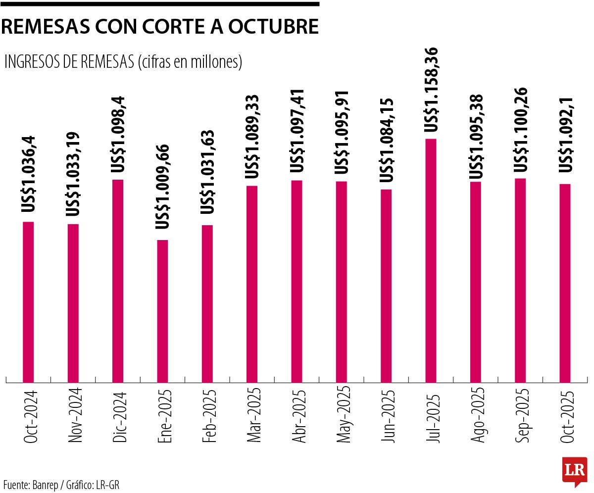 Las remesas siguen viviendo un buen comportamiento. Hasta octubre de este año, el país ya sumaba US$10.854 millones en ingresos por este concepto. Previo a conocer los datos de los dos meses que faltan para cerrar el año, es casi un hecho que se superó la meta dada por los analistas que prevén que 2025 se cierre con ingresos superiores a US$12.000 millones por el dinero que envían los colombianos desde el exterior.