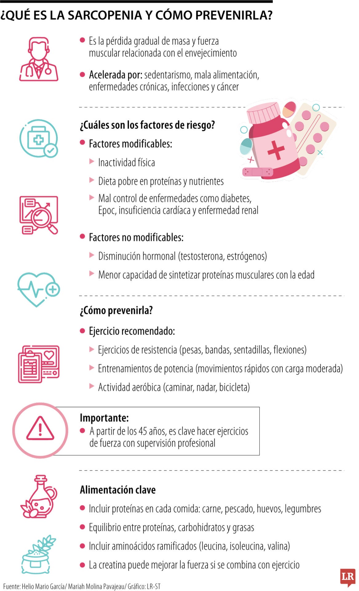 Según Helio Mario García, médico general, esta condición está relacionada “con el envejecimiento por mecanismos asociados a la disminución de estimulación nerviosa y reducción del metabolismo proteico del músculo, así como un desequilibrio hormonal que favorece a la degradación del músculo”.