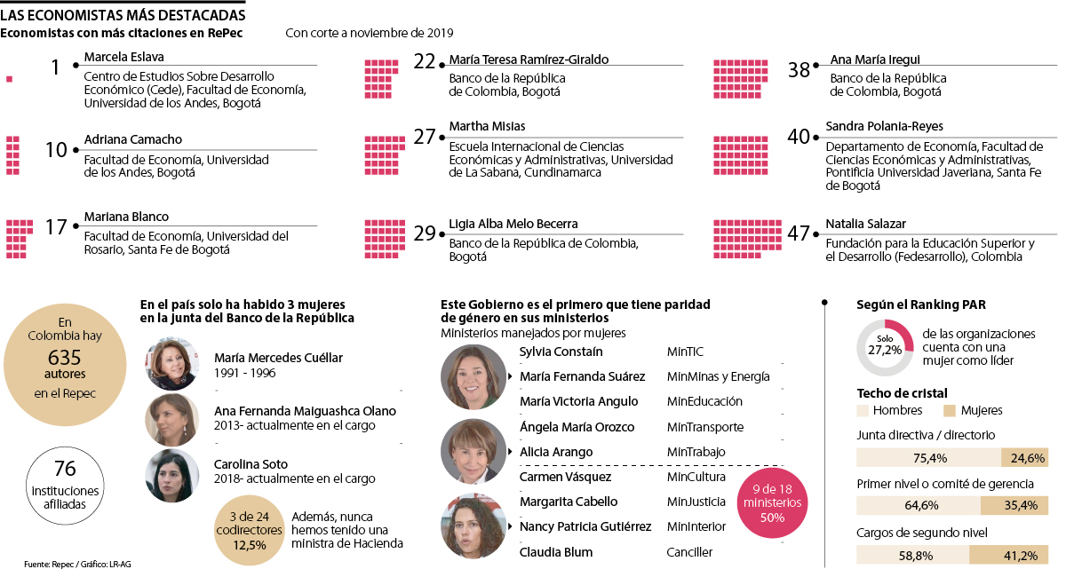Pese a este listado y a que las mujeres vienen ganando espacio en el mundo de los economistas, en la historia de Colombia nunca ha habido una ministra de Hacienda y de 24 codirectores que han pasado por el Banco de la República solo tres han sido mujeres. Dos de ellas están actualmente en el cargo: Ana Fernanda Maiguashca y Carolina Soto Losada.