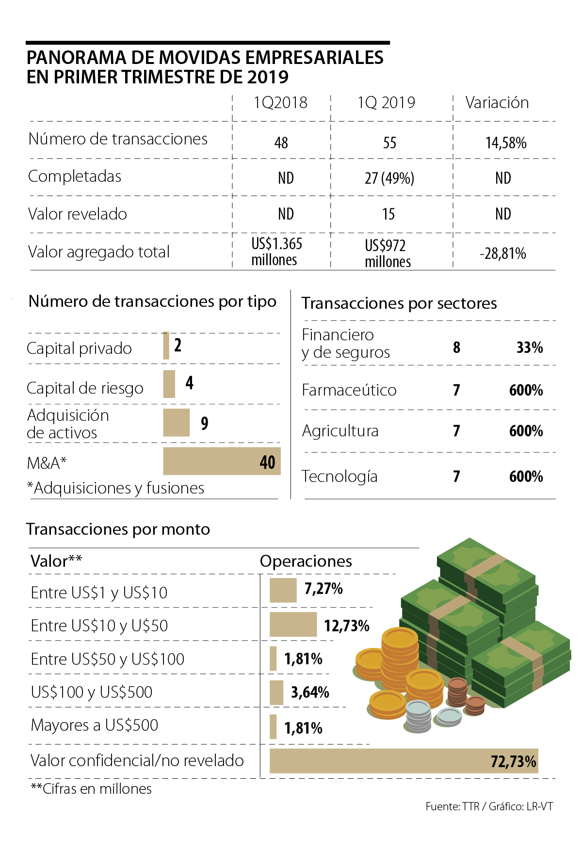 Ahora bien, si las transacciones se revisan por sector, el que mayor número de operaciones contabilizó fue el financiero y de seguros con ocho, cifra que aumentó 33% comparado con el mismo trimestre de 2018.
