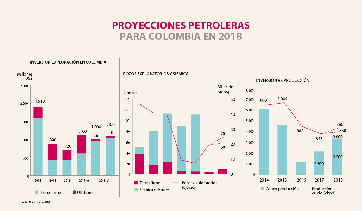 Un momento oportuno en Colombia, cuando la industria cumple 100 años en el territorio, con el inicio de la explotación de Infantas Dos en Barrancabermeja con la producción de 2.000 barriles diarios. Este 2018, podría convertirse así en un segundo aire, después de años difíciles en los que las inversiones alcanzaron a caer a US$2.040 millones, desde un máximo de US$8.390 en 2014. Los cálculos de la Asociación Colombiana del Petróleo en su Estudio de Tendencias de Inversión, señalan que las petroleras pueden completar inversiones en exploración y producción el próximo año por US$4.900 millones; esto si los precios se mantienen sobre los US$50; e incluyen el capital en proyectos aplazados de 2017, US$120 millones para gas natural; US$3.610 millones para recobro primario, y una exploración enfocada en tierra firme.