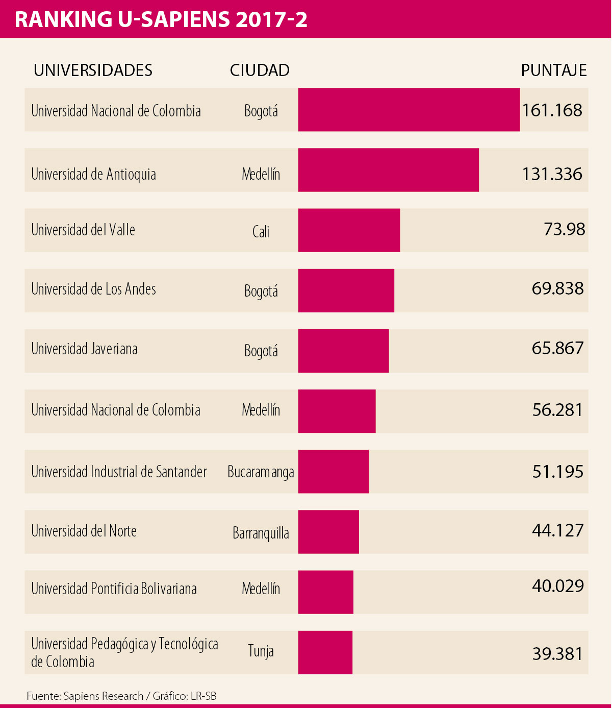 De acuerdo al último ranking de U-Sapiens 2017-2, la Universidad Nacional de Colombia (Bogotá) es la mejor institución de educación superior en el país, tomando como base indicadores de investigación.