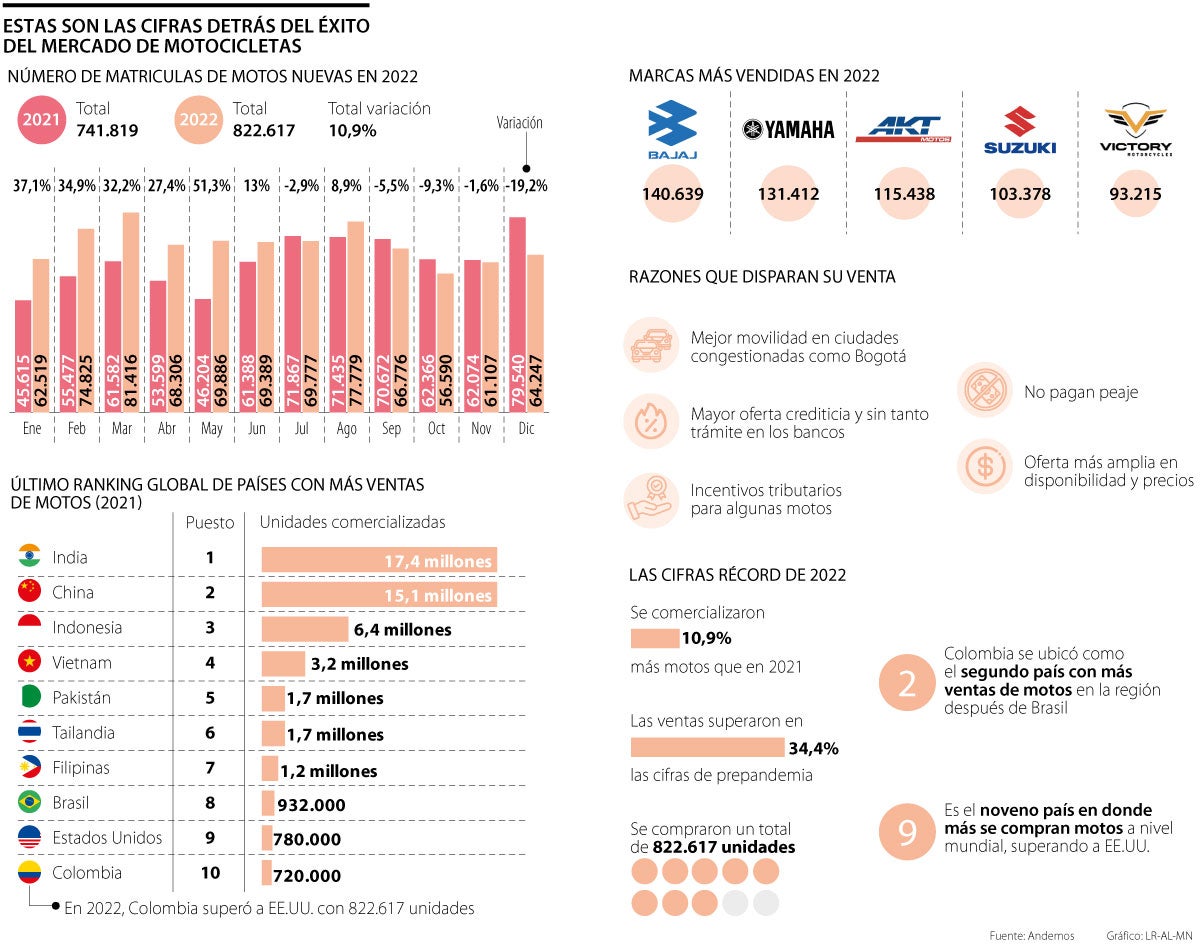 Mientras los carros crecieron 4,8% en 2022, las motos lo hicieron por encima de 10,9%, y 34,4% frente a 2019. Por lo que 2022 fue un año histórico para las marcas de motos. Lograron comercializar un total de 822.617 unidades; en 2021 las ventas habían sido de 741.819; y para dimensionar aún más el éxito, en años prepandemia como 2019 se vendieron 612.086, según Andemos. Esta cifra hizo que Colombia se posicionara como el segundo país que más vende motos en Latinoamérica después de Brasil, y el noveno a nivel mundial, destronando en 2022 a Estados Unidos. Esto teniendo en cuenta que en un año Brasil vende 930.000 motos y EE.UU., 780.000.