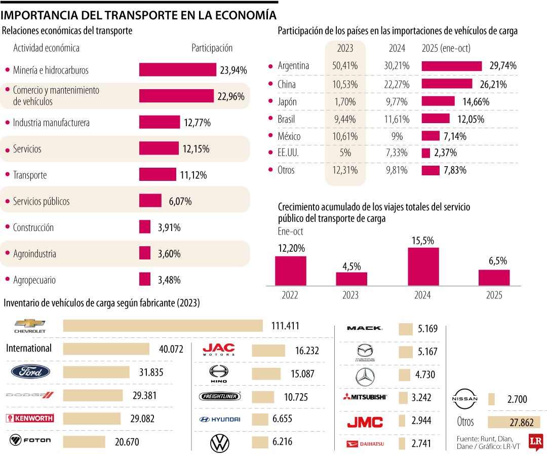 Los vínculos con la macroeconomía son variados. La compra de camiones depende en buena parte de las importaciones de vehículos de países como Argentina, China, Japón, Brasil, México y Estados Unidos, que concentran 92% del gasto por importación de este bien (US$745 millones entre enero-octubre de 2025).