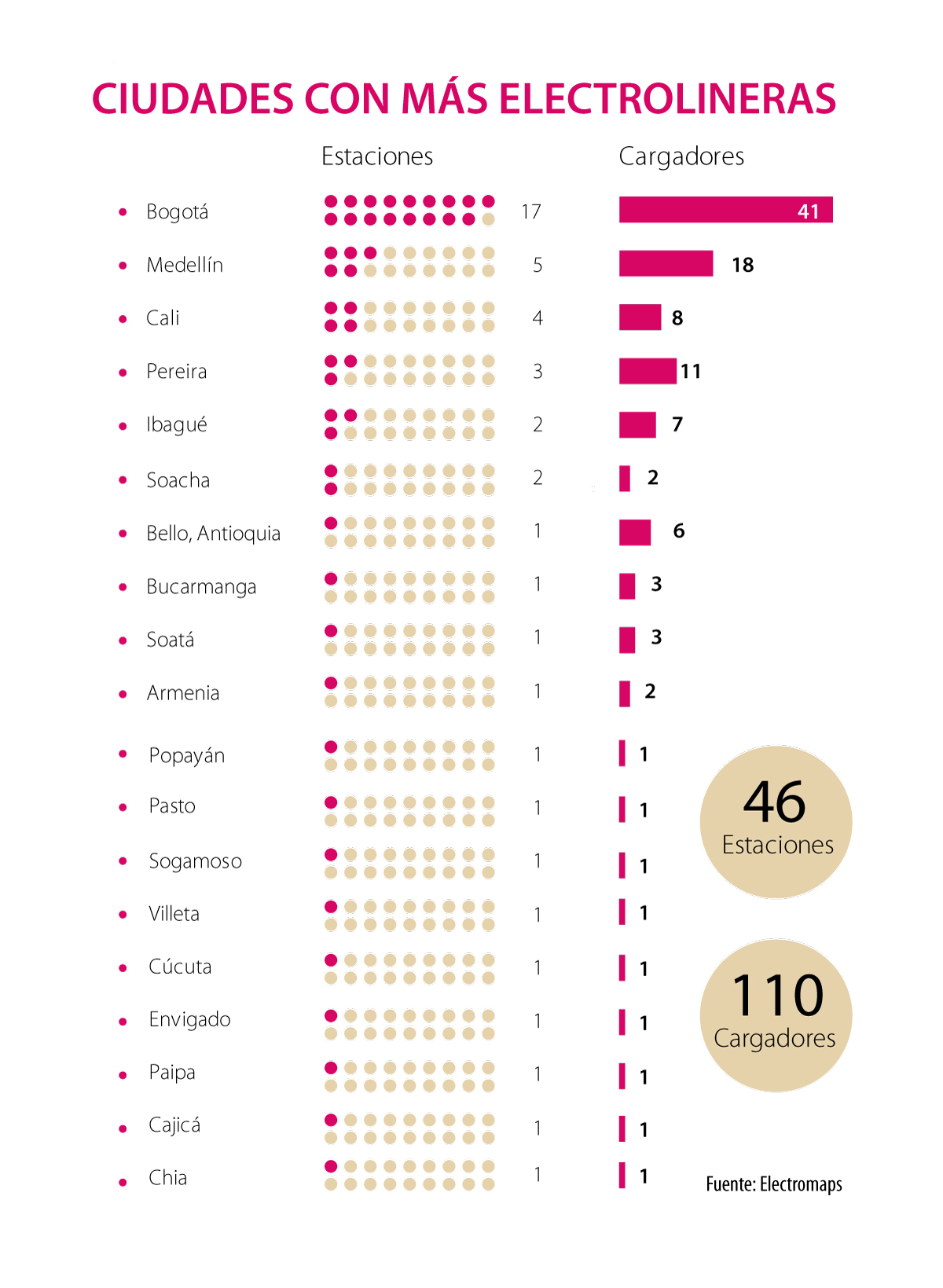 Otras de las ciudades con más electrolineras, según Electromaps, son Medellín con cinco estaciones de carga y 18 conectores, Cali con cuatro estaciones y ocho puntos de carga, Pereira con tres electrolineras y 11 conectores, y la capital del Tolima, Ibagué, con dos estaciones y siete cargadores.
