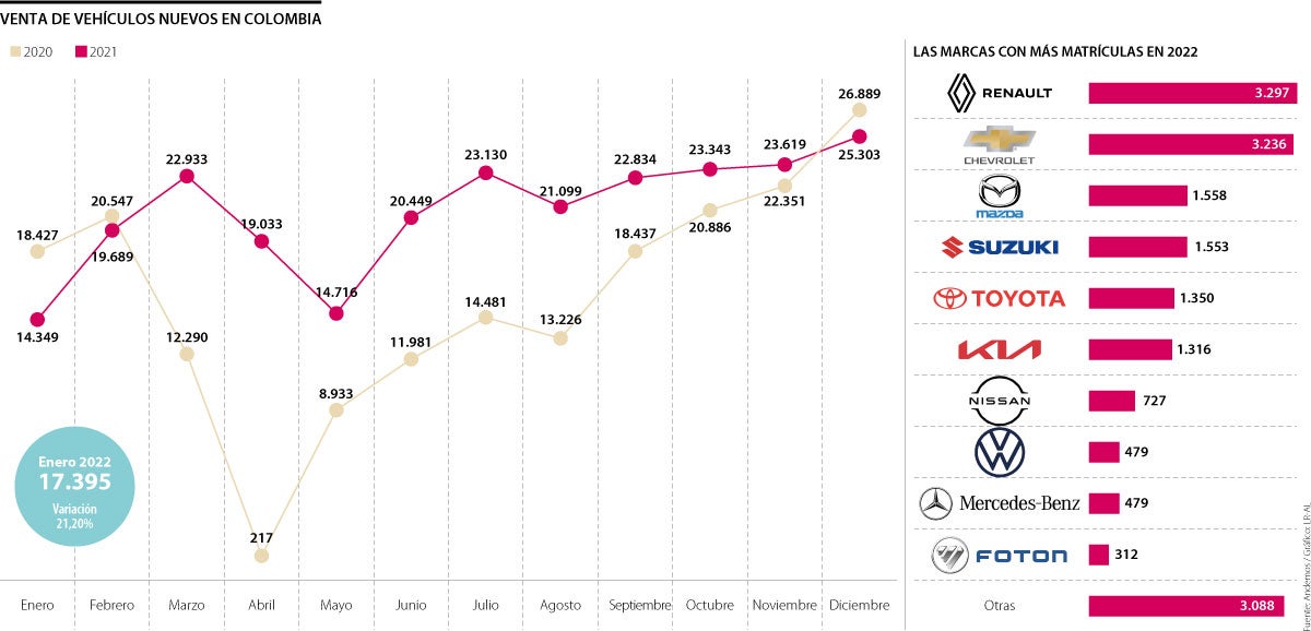 Las cifras de Andemos registran que los automóviles y los vehículos utilitarios llevan la delantera con 7.436 y 6.485 unidades respectivamente. Adicionalmente, la categoría de comerciales de pasajeros es la de mayor incremento versus 2021 con 251,49% y 355 matrículas; seguida por la de comerciales de carga de menos de 10,5 toneladas, 88,8% y 1.766 unidades y los taxis con 44% y 399 unidades. A enero, los únicos segmentos en rojos son las pickups, que se contrajeron 33,38% con 461 unidades versus lo alcanzado el año anterior y las vans, 21,74% con 54 ventas.