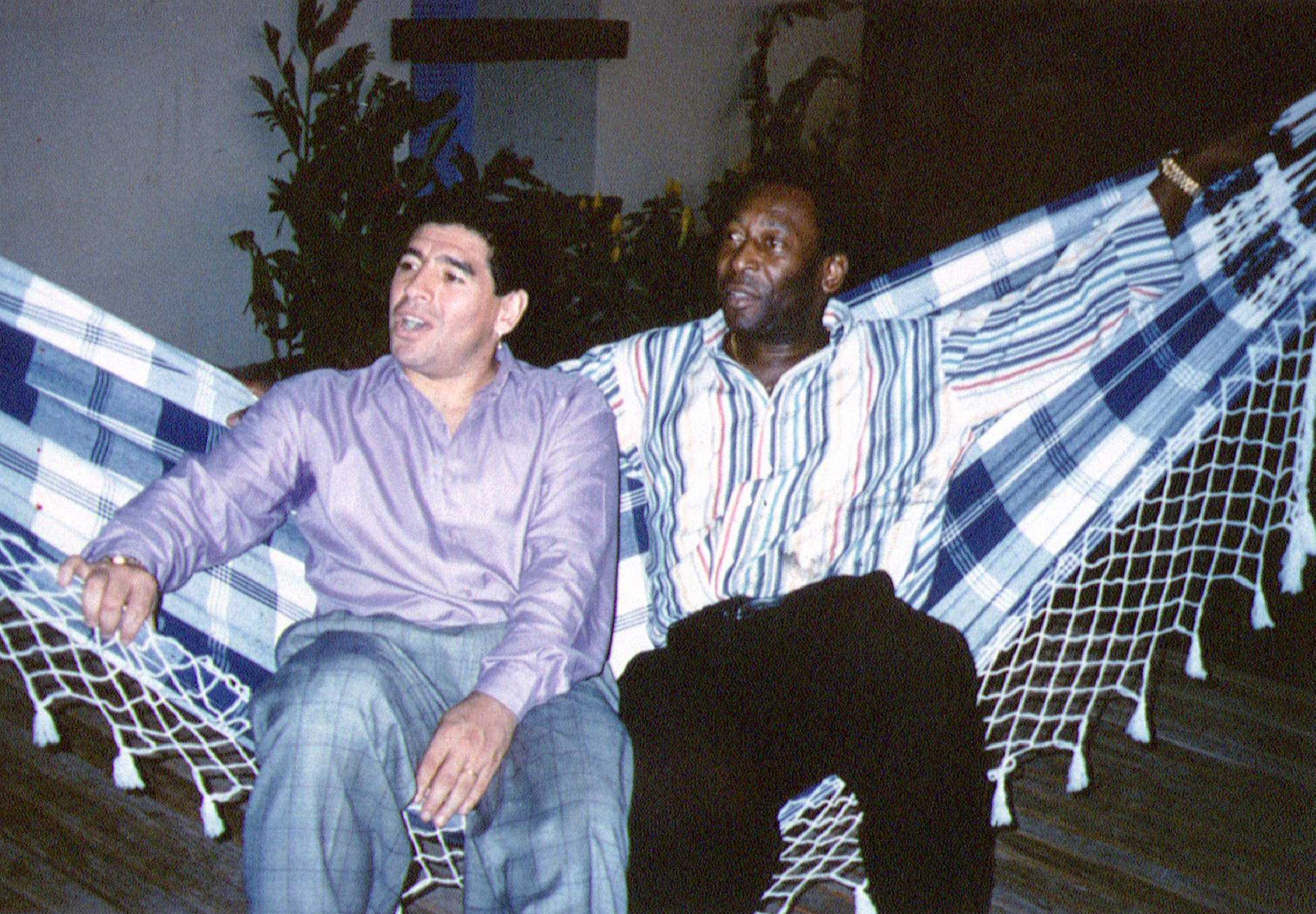 Dos leyendas del fútbol en un momento de descanso: Maradona y Pelé en una hamaca durante una recepción en Río de Janeiro, el 14 de mayo de 1995.