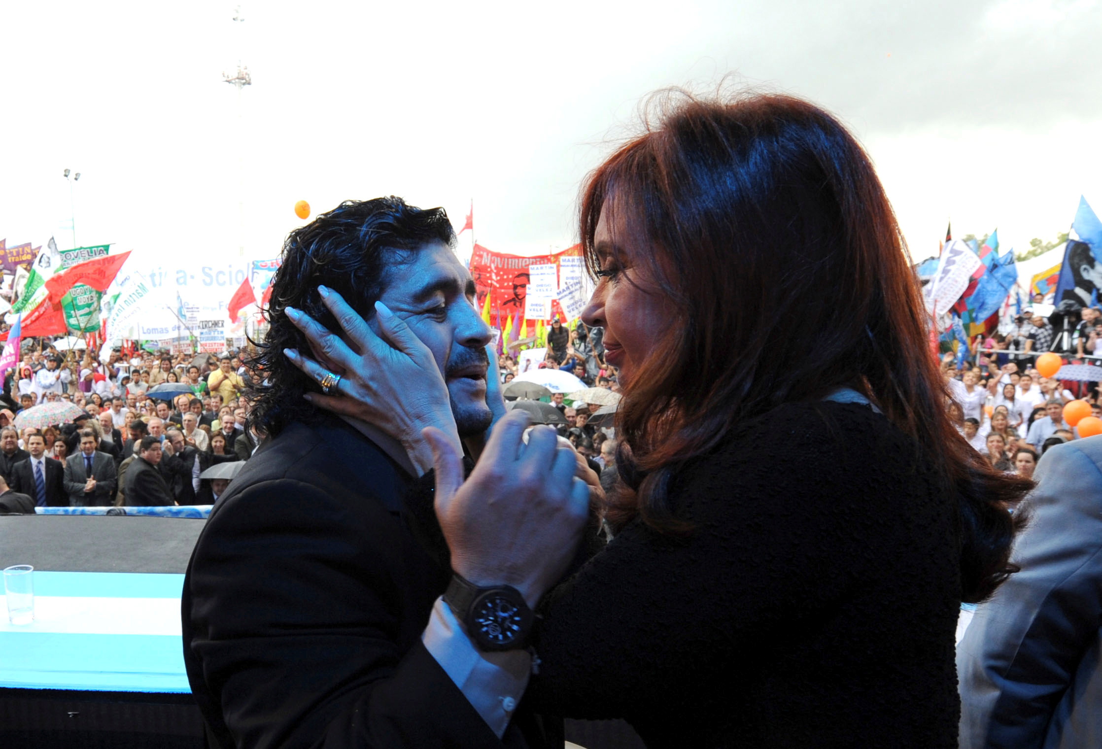 Y los personajes afines siguen. En la siguiente foto se ve a la expresidenta de Argentina, Cristina Fernández de Kirchner, saludando a Maradona durante un mitin en Buenos Aires el 2 de diciembre de 2010.