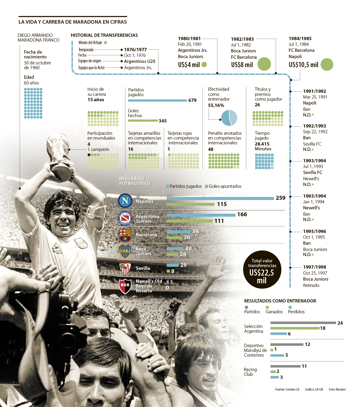 Su historia inició en 1981-82 cuando poco después de su debut con Argentinos a los 15 años, fue fichado por Boca Juniors con un contrato de US$4 millones. Allí, solo duró un año ya que su juego lo llevó al Barcelona, que lo compró por cerca de US$8 millones; una cifra récord para la época. Tras la expulsión del plantel catalán, el Napoli no dudó en ficharlo y se volvió a romper la tarifa de transferencia récord, con un pago de cerca de US$10,5 millones. En Italia, al Diego lo recibieron 75.000 espectadores y alcanzó uno de sus momentos cumbres con 115 goles en 259 encuentros. Al final, fue una leyenda viva con 679 partidos jugados y 345 goles en su carrera.