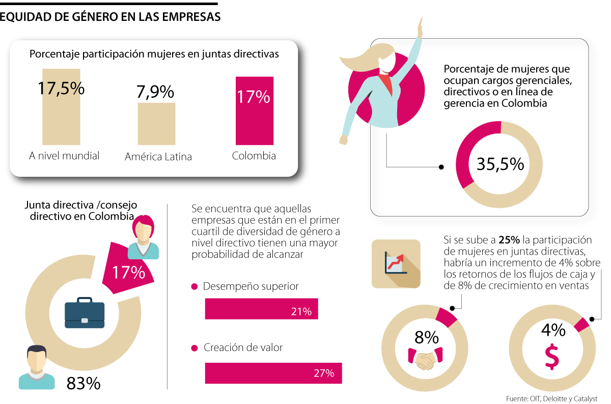 En el mundo empresarial, según el último reporte de la Superintendencia de Sociedades, 33,5 % de las mujeres colombianas ocupan cargos gerenciales, directivos o en línea de gerencia; cifra que se ubica por encima del promedio mundial de 29%.