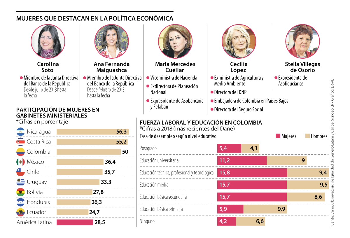A pesar de ello, esto no ha sido un freno para que las mujeres ocupen cargos de alto rango y den la movida en la política económica local. Son varios los nombres que salen a relucir. Dentro del área macroeconómica resaltan profesionales como Carolina Soto, miembro de la Junta Directiva del Banco de la República desde 2018; Ana Fernanda Maiguashca, también miembro de la junta del Emisor desde 2013; María Mercedes Cuéllar, exviceministra de Hacienda, Cecilia López, exministra de Agricultura y Medio Ambiente y Stella Villegas de Osorio, quien pasó por la presidencia de Asofiduciarias.