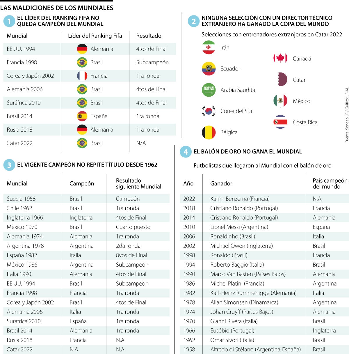 Estas son algunas "maldiciones" para algunos equipos que le podrían quitar favoritismo para ganar el Mundial de Catar 2022.