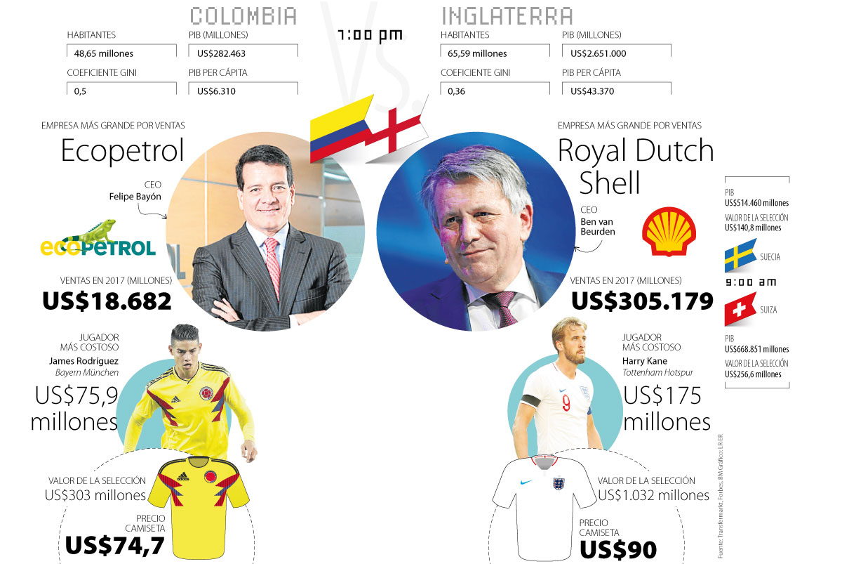 Hace 20 años, en Francia 98, Colombia e Inglaterra se enfrentaron por primera y última vez en un mundial. Los europeos derrotaron a los cafeteros 2 a 0, dejándolos por fuera en la fase de grupos. Hoy Colombia va por la revancha. Ahora, si en vez de enfrentarse en la cancha, estos países definieran su paso a cuartos por las ventas de sus petroleras más grandes, Inglaterra volvería a dejar a Colombia por fuera del mundial, pues Shell vendió US$305.170 millones en 2017, mientras que Ecopetrol vendió US$18.682 millones. Además, del partido en el mundial del 98, Colombia e Inglaterra han jugado cuatro amistosos, dos de ellos terminaron en empate y dos en victoria para los anglosajones. Si bien las estadísticas e indicadores como el PIB o el Gini están en contra de Colombia, la tricolor tiene talento para sorprender.