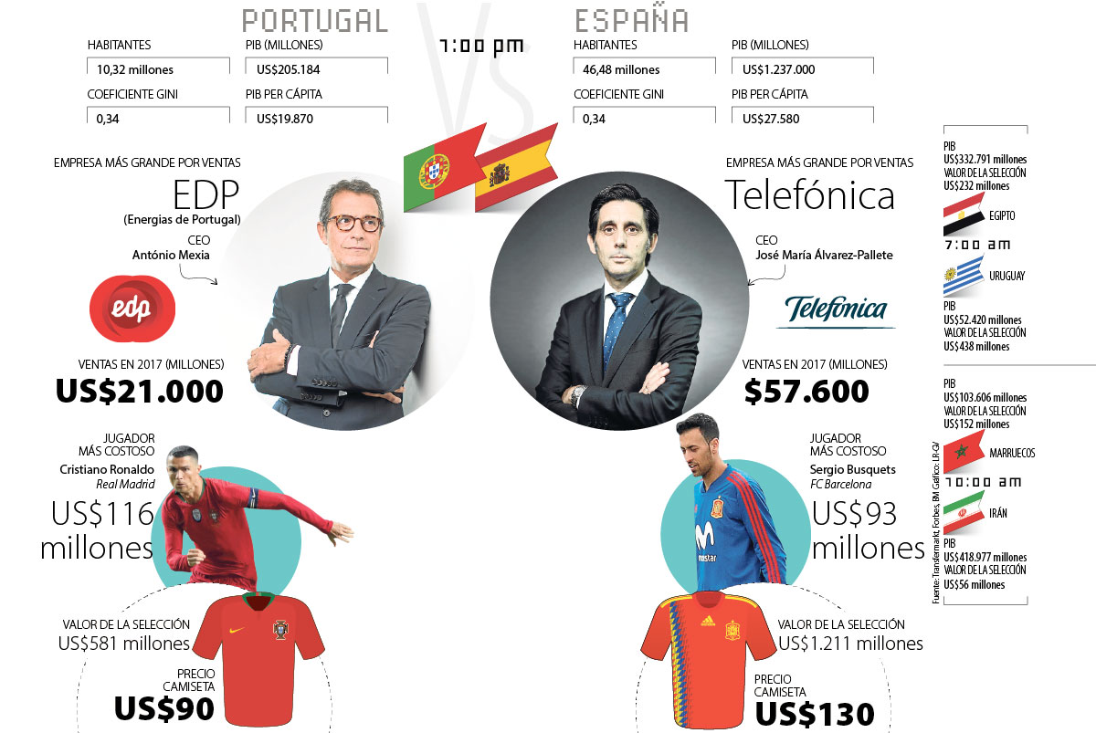 En el mejor de los escenarios, los equipos empatarían por su 0,34 en el coeficiente de Gini; mientras que España tendría la ventaja si el ganador se escogiera por PIB, pues la cifra del equipo que dirige Fernando Hierro, se ubica en US$1.237.000 millones, frente a los US$205.184 millones del país del equipo que lidera el técnico Fernando Santos.