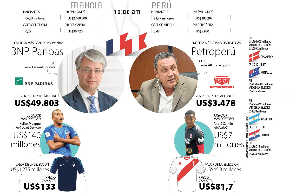La histórica clasificación de la Selección Peruana podría verse empañada por su corta participación en la Copa del Mundo. Los ‘incas’ necesitan sumar tres puntos ante Francia para salvarse y no depender del resultado de sus contrincantes. La blanquiroja, por los colores de su bandera, representa una economía de US$192.200 millones, que espera verla convertida en protagonista de la cita mundialista. Por su parte, los franceses llegarán cómodos al encuentro gracias a su victoria en la primera jornada. Sus connacionales, que representan un PIB de US$2,4 billones, esperan que el resultado se logre con la ayuda de su jugador Kylian Mbappé, cuya valoración es de US$140 millones gracias a su participación en el Paris Saint Germain.