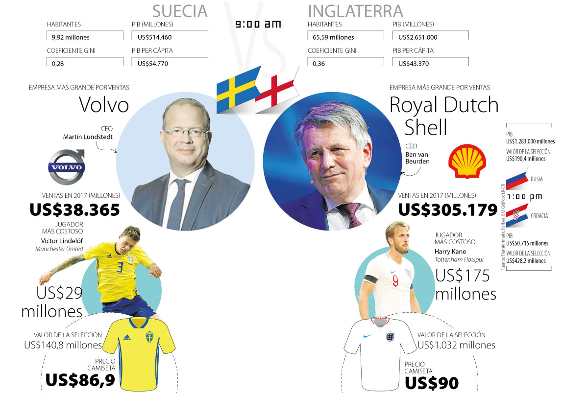 Hoy se enfrentarán por tercera vez en este siglo las selecciones de Suecia e Inglaterra en un Mundial. La primera vez fue en Corea Japón 2002, en el que empataron, y la segunda vez fue en Alemania 2006, en el que volvieron a empatar. Sin embargo, en esta oportunidad sí deberá haber un ganador y un perdedor. Si el paso de los equipos a la siguiente etapa se definiera por sus recientes encuentros, el ganador sería Suecia, pues en su último amistoso internacional, que fue en 2012, vencieron 4-2 a los ingleses. En cambio, si el partido se definiera por el valor del jugador más costoso en la cancha, Inglaterra resultaría victoriosa, ya que Harry Kane es US$146 millones más caro que Victor Lindelöf. En ventas, Royal Dutch Shell tiene la ventaja sobre Volvo, pero por PIB per cápita y Gini gana Suecia.