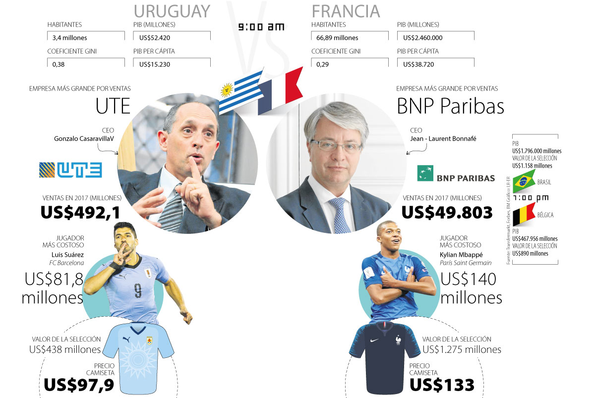 Francia y Uruguay se encuentran por cuarta vez en un Mundial y por novena en la historia del fútbol. A pesar de que las estadísticas favorecen al conjunto uruguayo con tres victorias, cuatro empates y solo una derrota, no en todos los aspectos ganan. Si pasar a la semifinal dependiera de aspectos económicos, como el total de ventas de la empresa más grande del país, los franceses ganarían con US$49.803 millones de BNP Paribas contra US$492,1 millones de UTE de Uruguay, la más grande del sudamericano. A pesar de las estadísticas y los aspectos económicos, 3,4 millones de uruguayos sueñan con volver a ver a su selección campeona como en 1930 y en el famoso Maracanazo de 1950, mientras que 66,89 millones de franceses esperan que su equipo repita la historia del Mundial del 98.