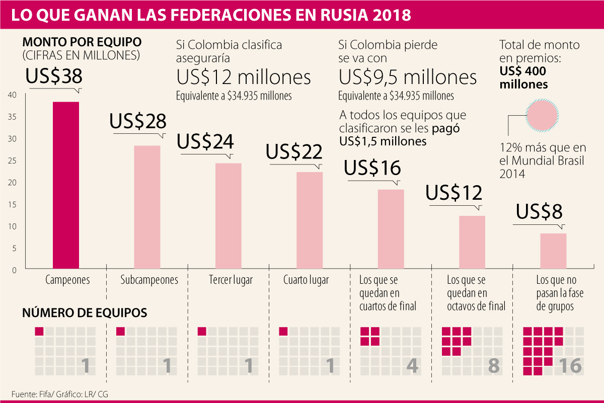 El subcampeón logrará llevarse a su país US$28 millones mientras que el campeón de esta edición del Mundial de fútbol de la Fifa, recibirá US$38 millones. Estos premios, por supuesto, no incluyen los ingresos por publicidad de cada equipo.