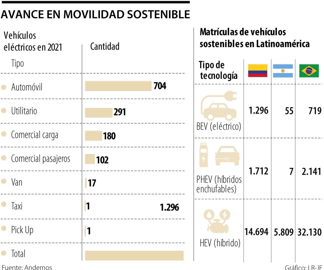 Con 1.296 unidades, Colombia fue el de mayor número de matrículas de vehículos eléctricos registradas en Latinoamérica en 2021, según informó la Asociación Nacional de Movilidad Sostenible (Andemos). Sin embargo, si se analiza el mercado de vehículos sostenibles en general, Colombia es superado por otros países como México y Brasil, con 47.079 y 34.990 vehículos respectivamente.