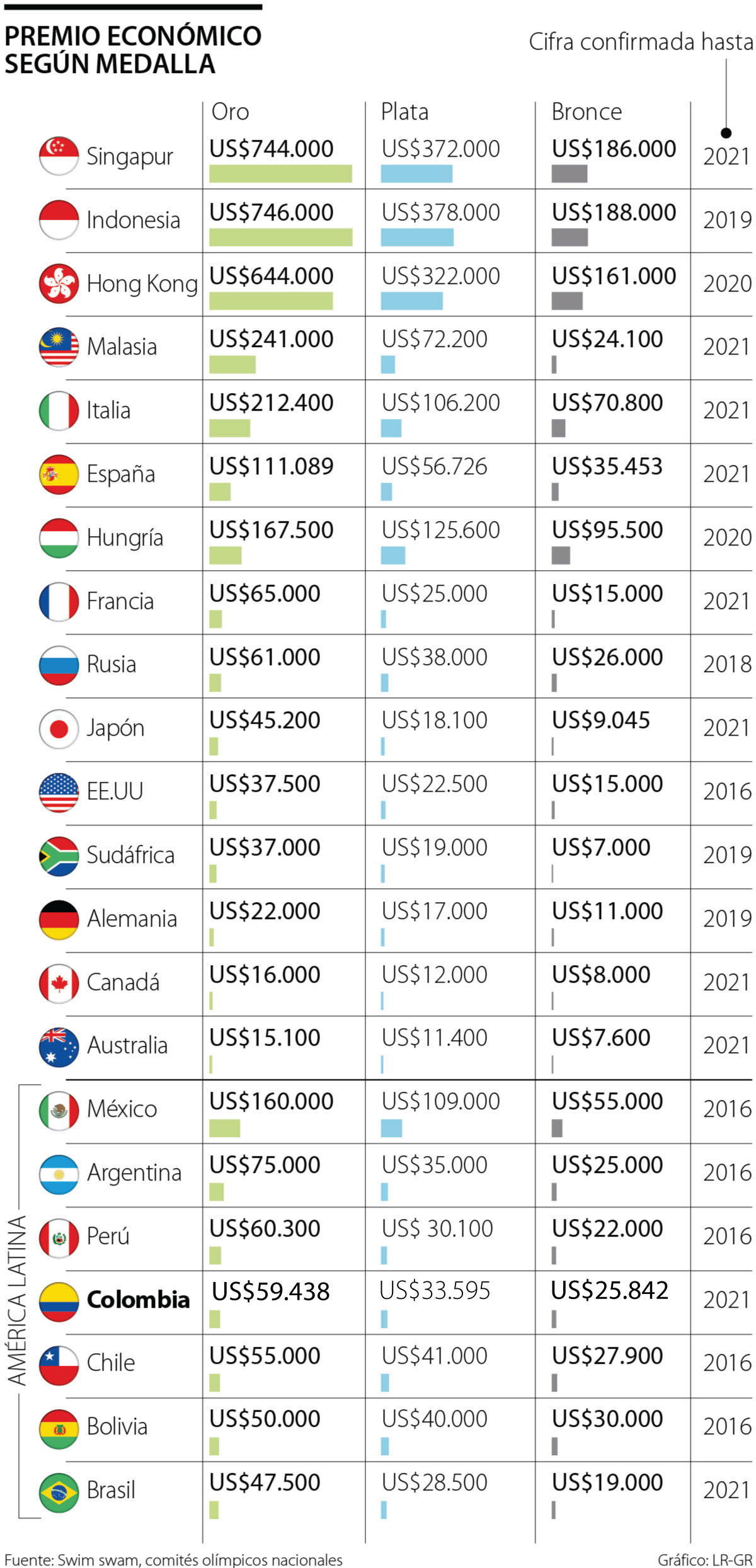 Aunque EE.UU. es el líder en medallería, no da el premio más grande, hay naciones como Indonesia que su recompensa equivaldría a más de US$3 millones, y Singapur que en 2016 ganó su primer oro y entregó US$753.000 al deportista.