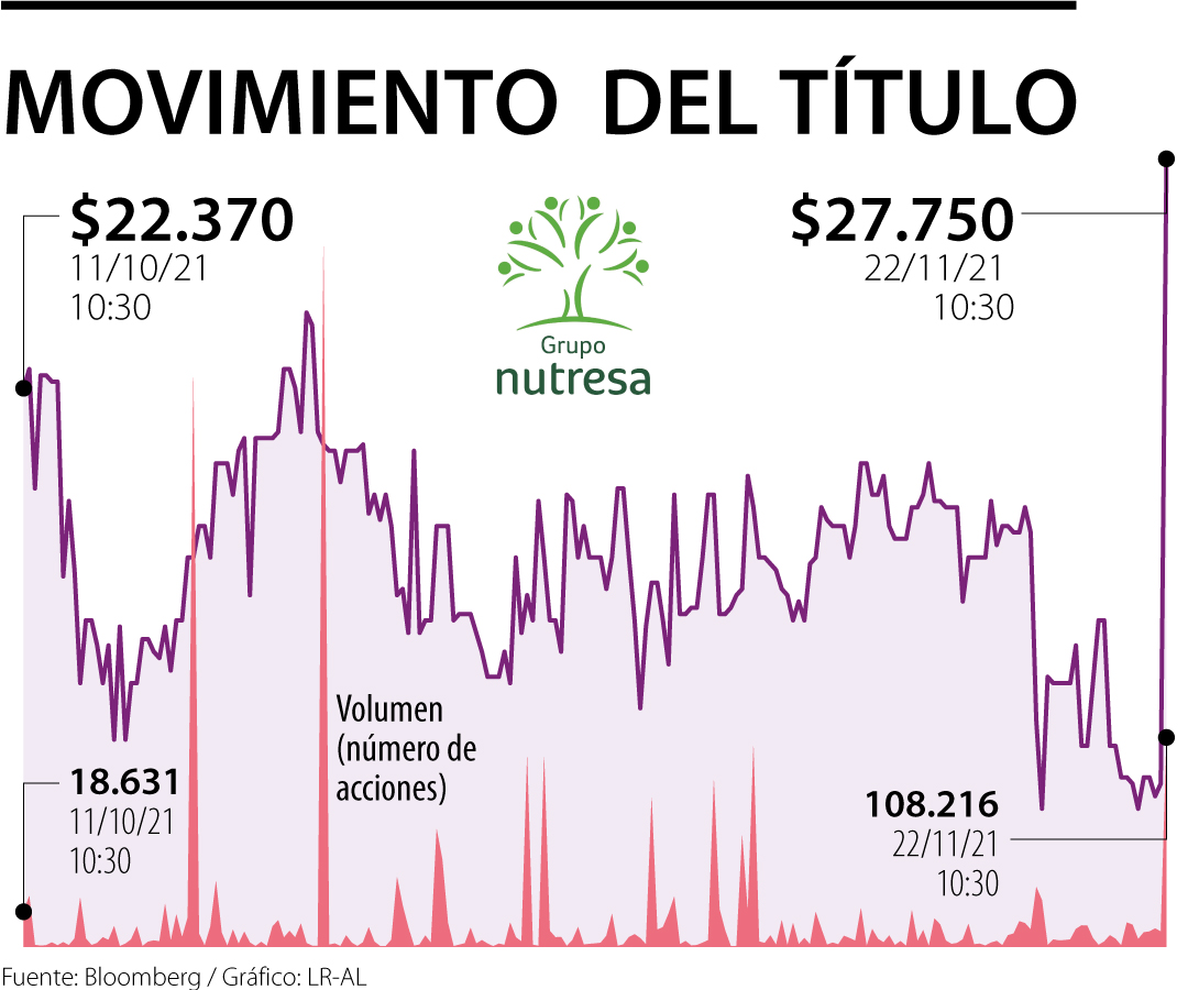 Luego de que este domingo fuese publicado el primer aviso oficial de la Oferta Pública de Adquisición (OPA), la acción del Grupo Nutresa volvió a cotizar en la Bolsa de Valores de Colombia (BVC) tras una subasta inicial de volatilidad. La especie crece a esta hora 27,64% y se cotiza a $27.750, mientras que el índice bursátil Msci Colcap se trepa 1,78% a 1.321 puntos.