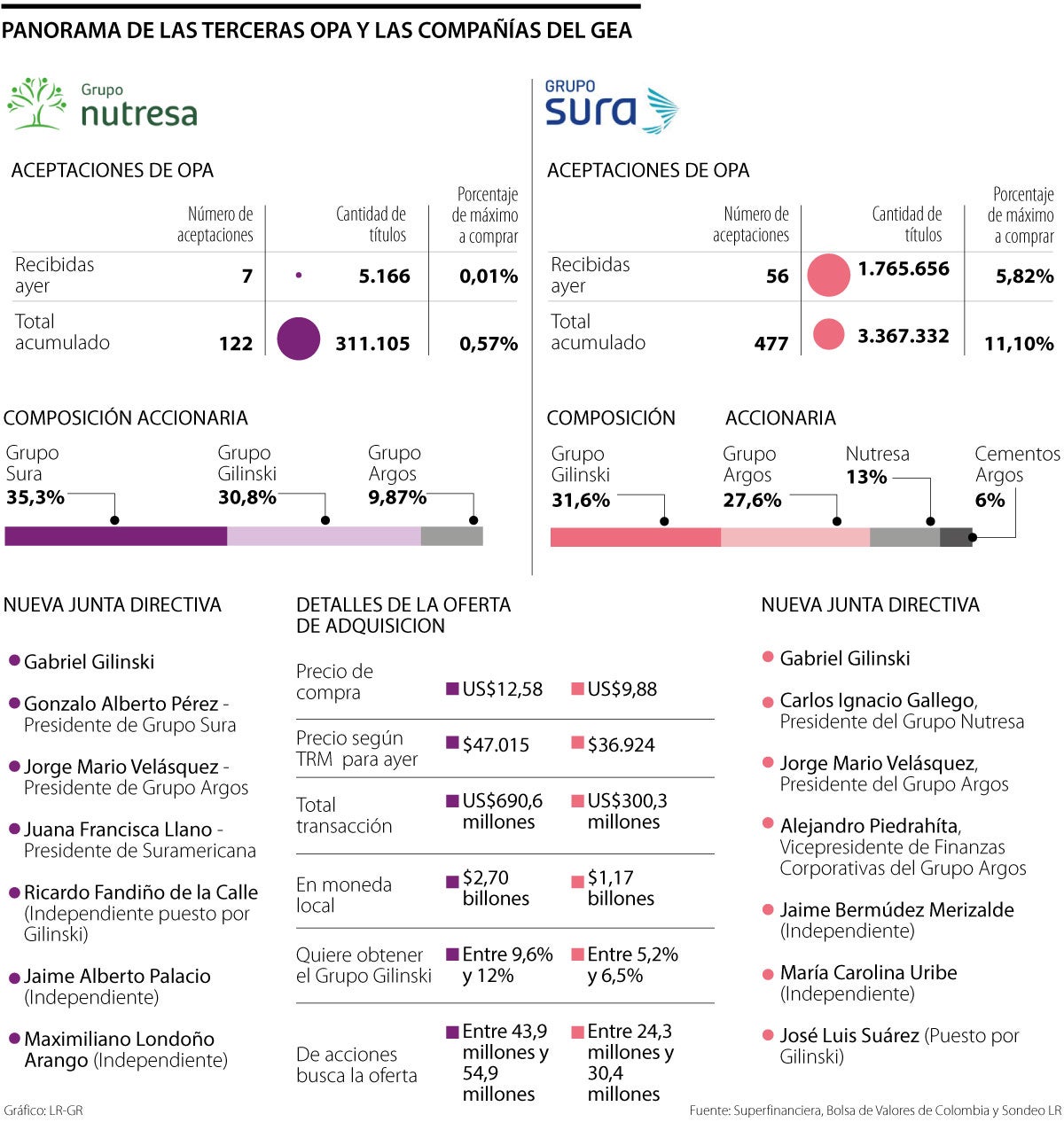 Esta semana será decisiva para el futuro de la tercera ronda de las OPA lanzadas por el Grupo Gilinski para seguir sumando participación accionaria en Sura y Nutresa y, con ello, un mayor poder en el Grupo Empresarial Antioqueño (GEA). Los socios de los mayores accionistas de ambas empresas votarán entorno a posibles conflictos de interés expresados por los miembros de las juntas directivas.