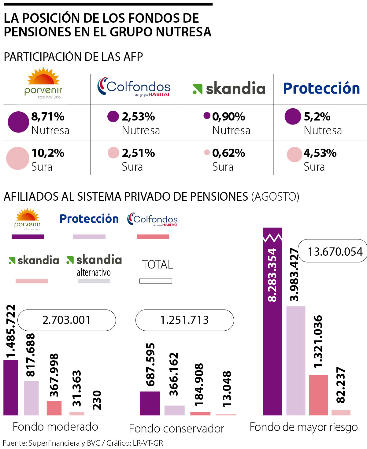 Según cifras de la Superintendencia Financiera de Colombia (SFC) con corte a agosto, existen 17,62 millones de afiliados al sistema de jubilación privado. Dicha cantidad de trabajadores se encuentra repartida especialmente en los fondos de mayor riesgo, vehículo de inversión en el cual se encuentran 13,67 millones de personas, siendo Porvenir, con 8,28 millones, y Protección, con 3,98 millones de colombianos, los que abarcan una gran parte del mercado. A estos les siguen los fondos moderados, en los que hay 2,70 millones de cotizantes y los cuales tenían una mayor porción en las compañías del GEA.