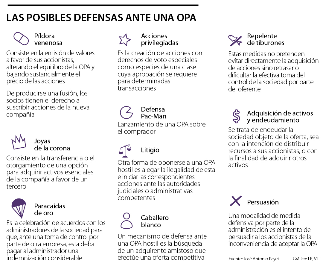 En términos de acciones defensivas, sobresale el ‘Caballero blanco’, un mecanismo que responde a una toma intempestiva y que pretende encontrar un comprador amistoso que presente una oferta competitiva.