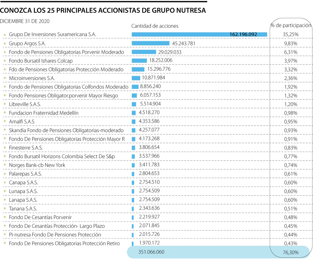 Si analizamos solo los accionistas de Nutresa, también está el Fondo de Pensiones Obligatorias Porvenir Moderado y el Fondo Bursátil Ishares Colcap como principales, con un porcentaje de 6,31% y 3,97%, respectivamente, es decir, con 29,02millones y 18,2 millones acciones. (Ver gráfico).