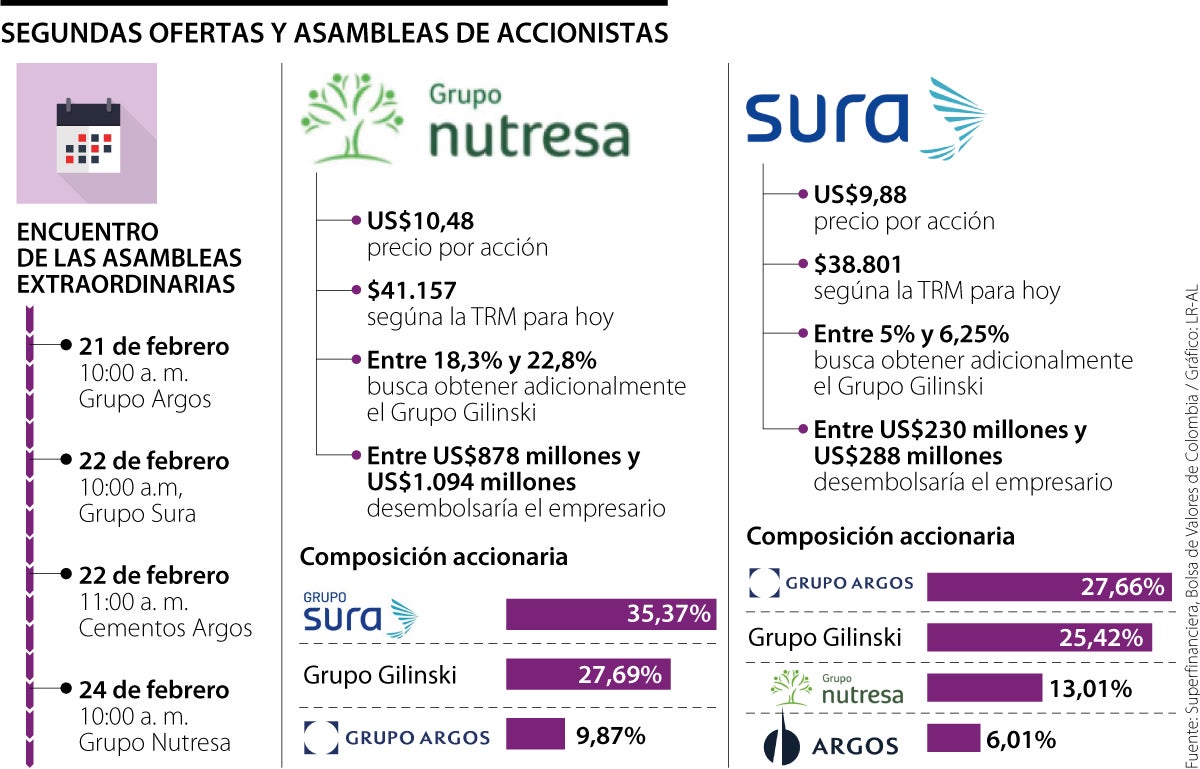 Ese mismo día, los participantes de Cementos Argos se verán sobre las 11:00 a.m. en el Centro Empresarial Buenavista. Los últimos en reunirse serán los integrantes de Grupo Nutresa, quienes fueron citados para el 24 de febrero a las 10:00 a.m., en el Centro Empresarial El Poblado de la Cámara de Comercio de Medellín.